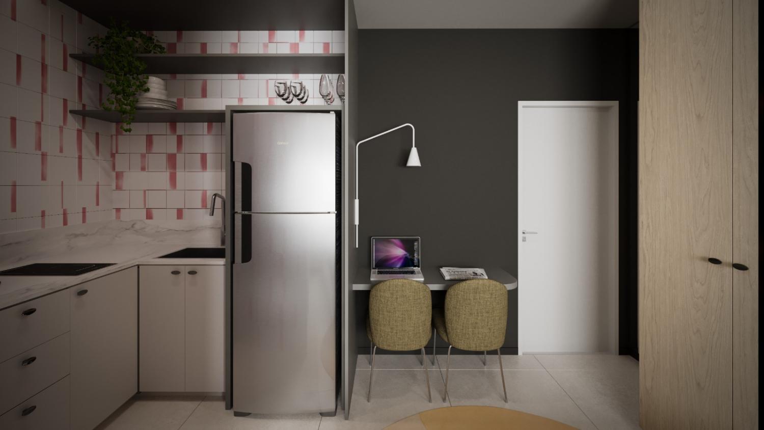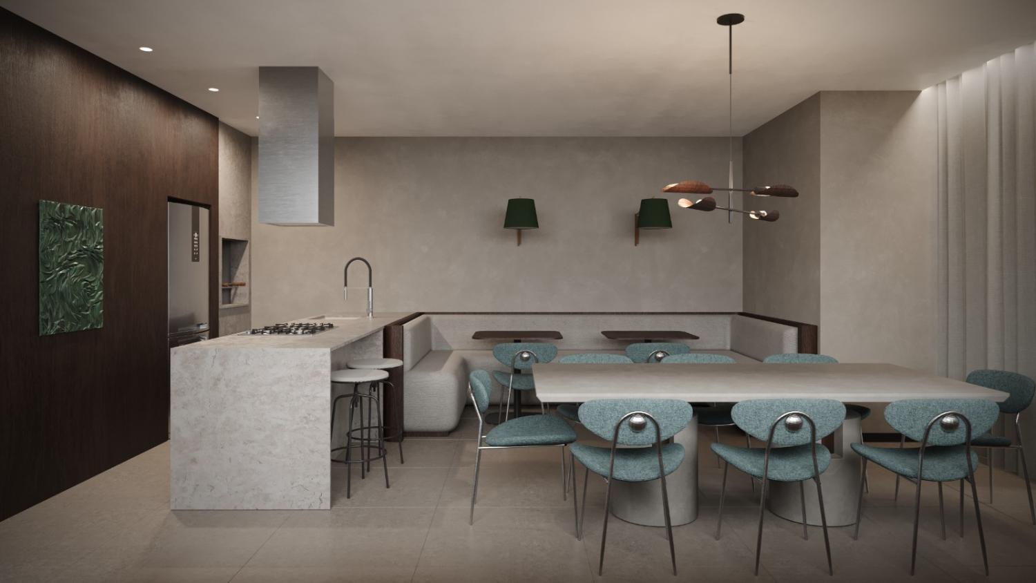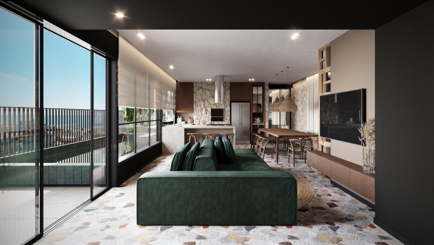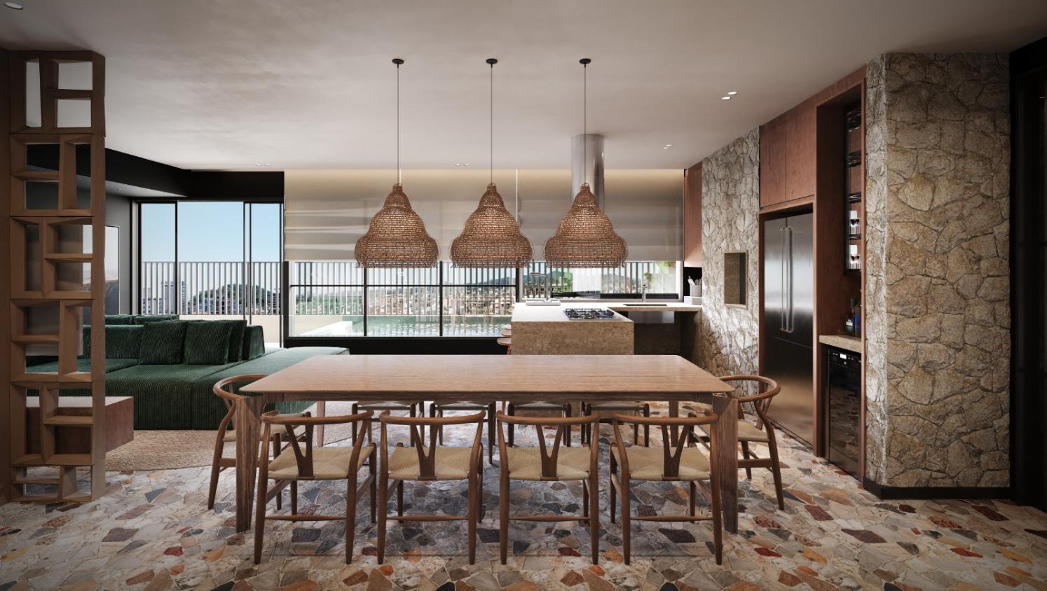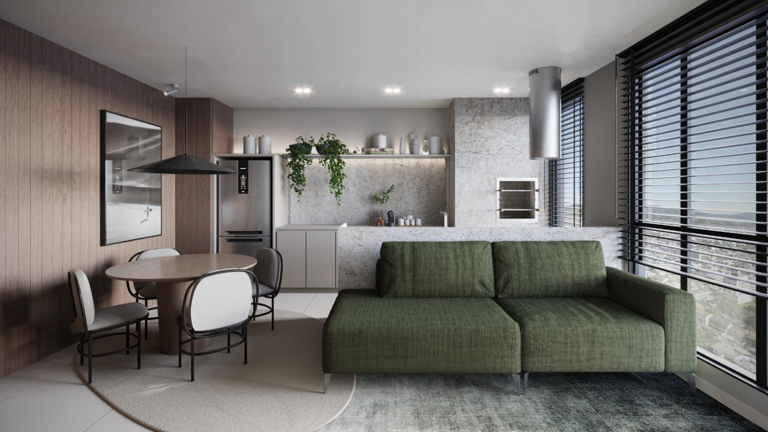 Living integrado: Cozinha, sala de jantar e sala de estar;