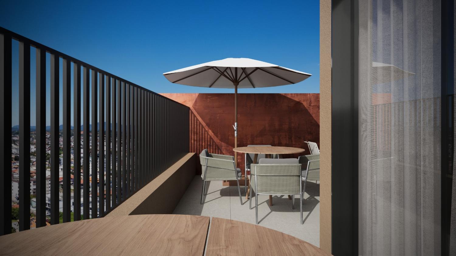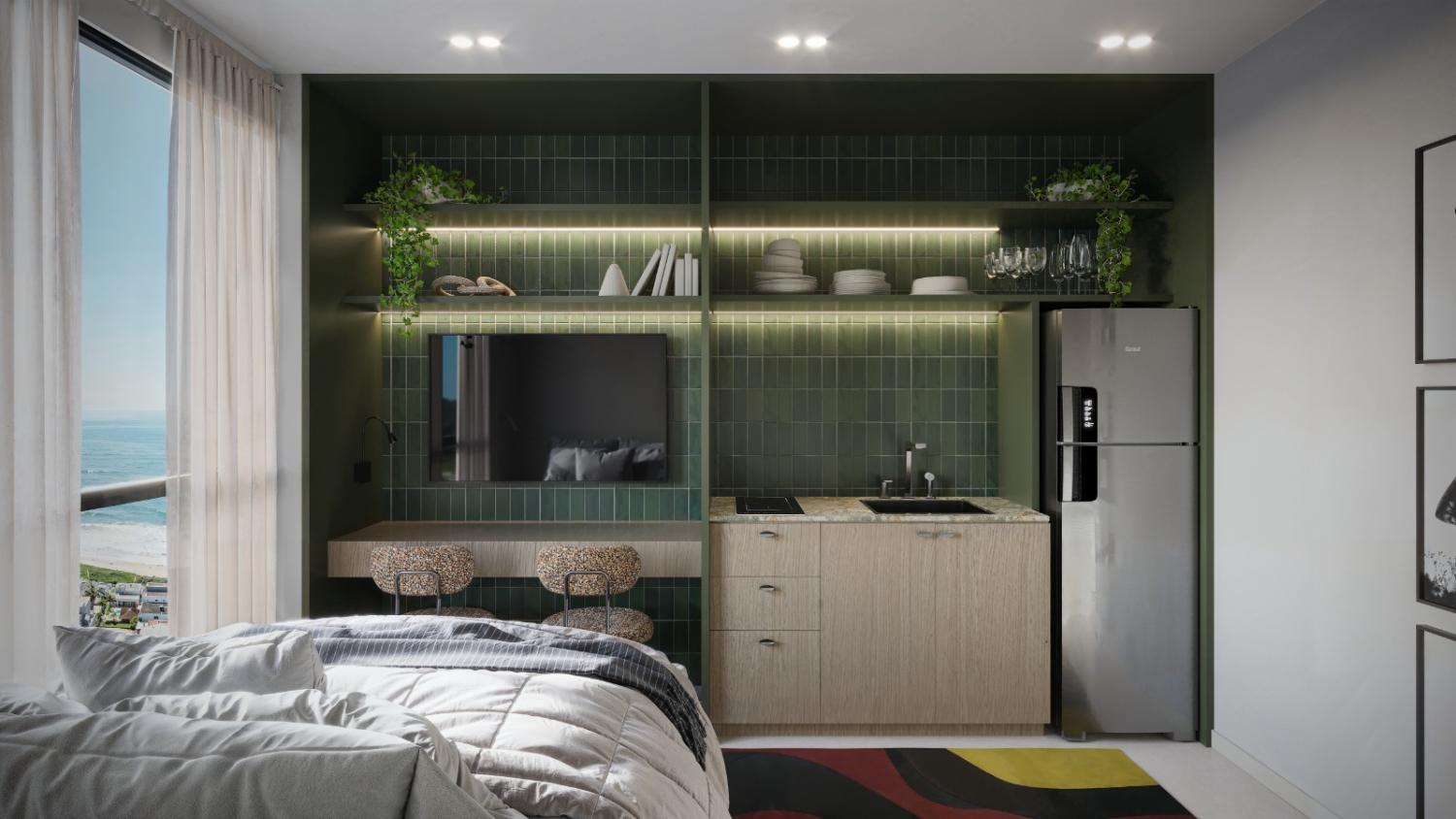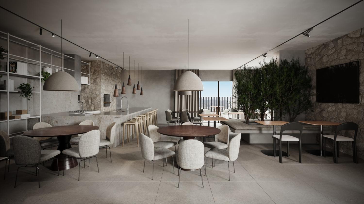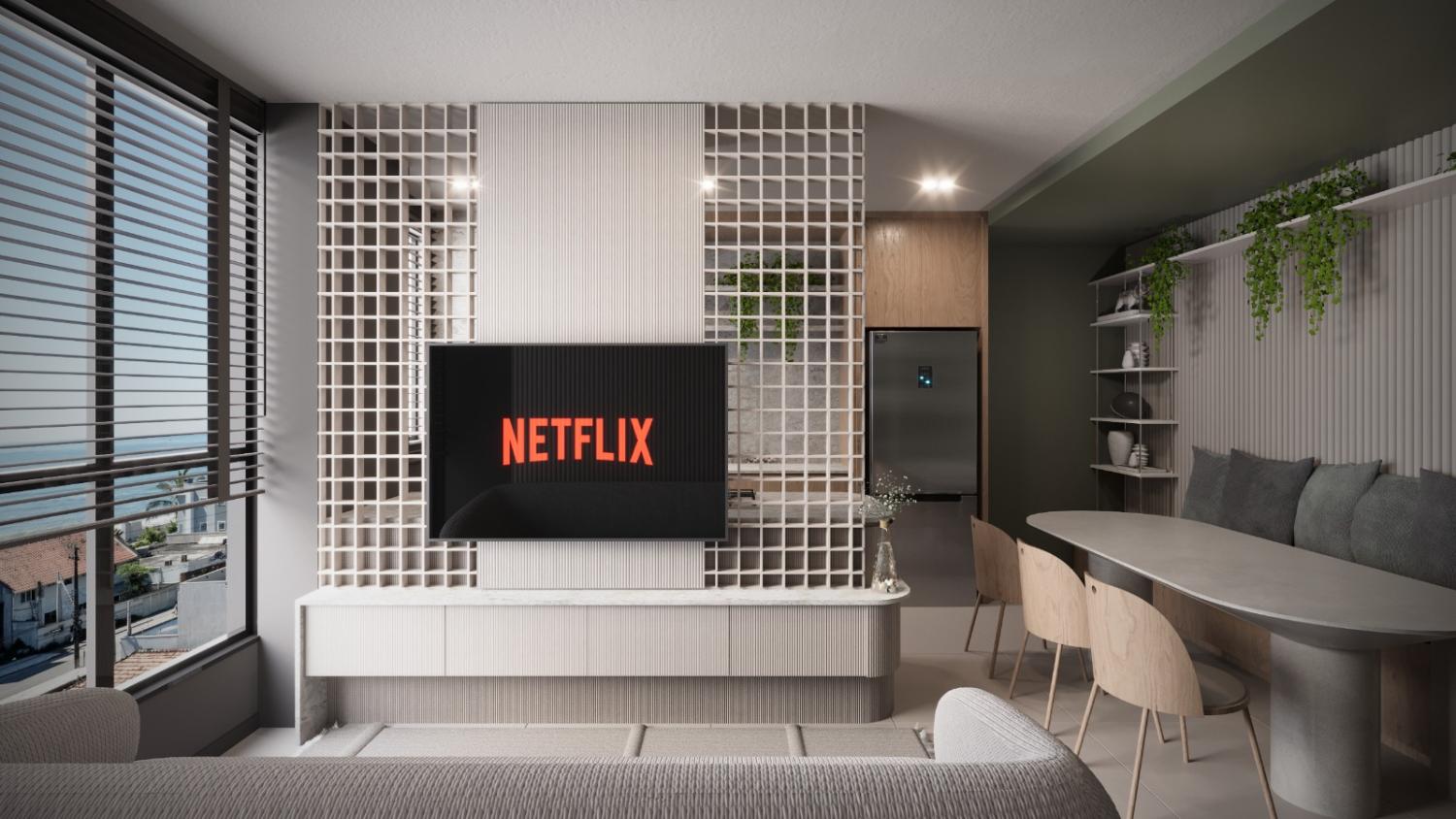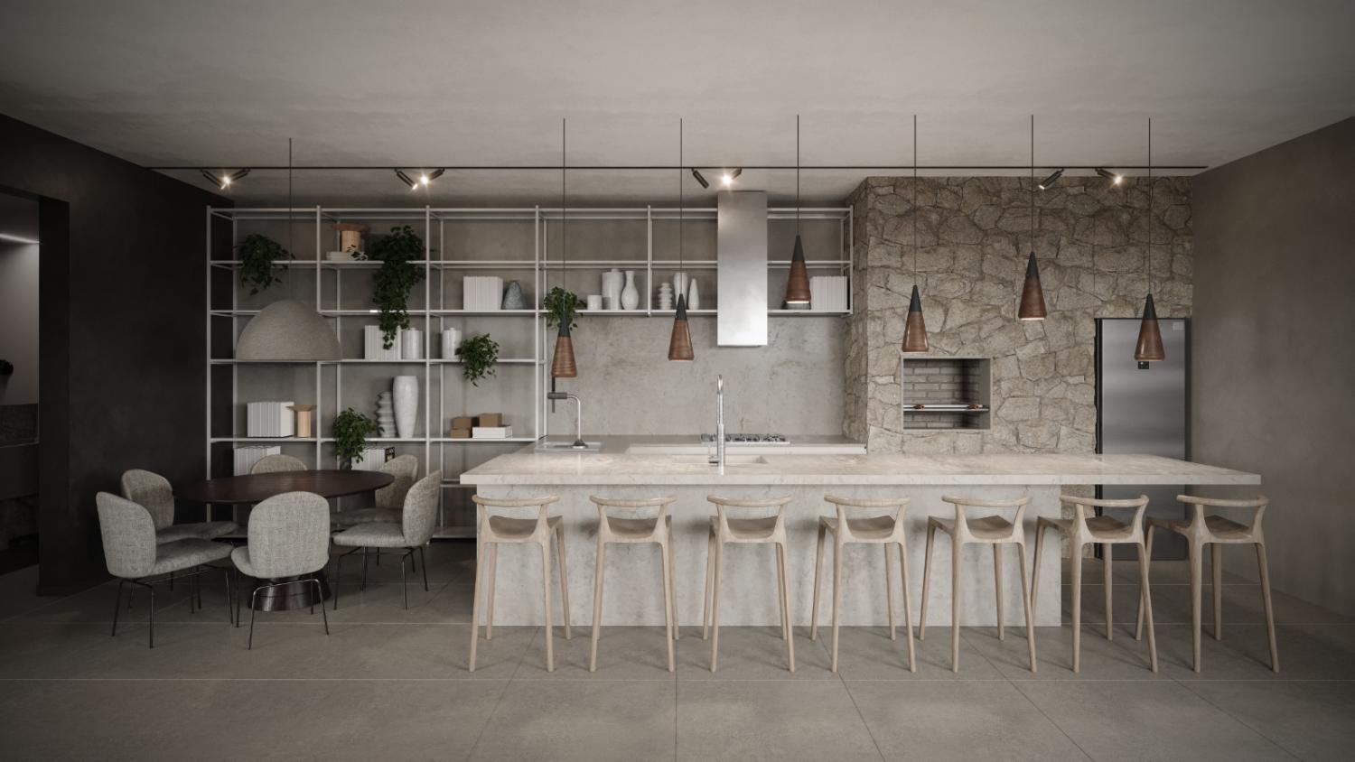 Living integrado: Cozinha, sala de jantar e sala de estar;